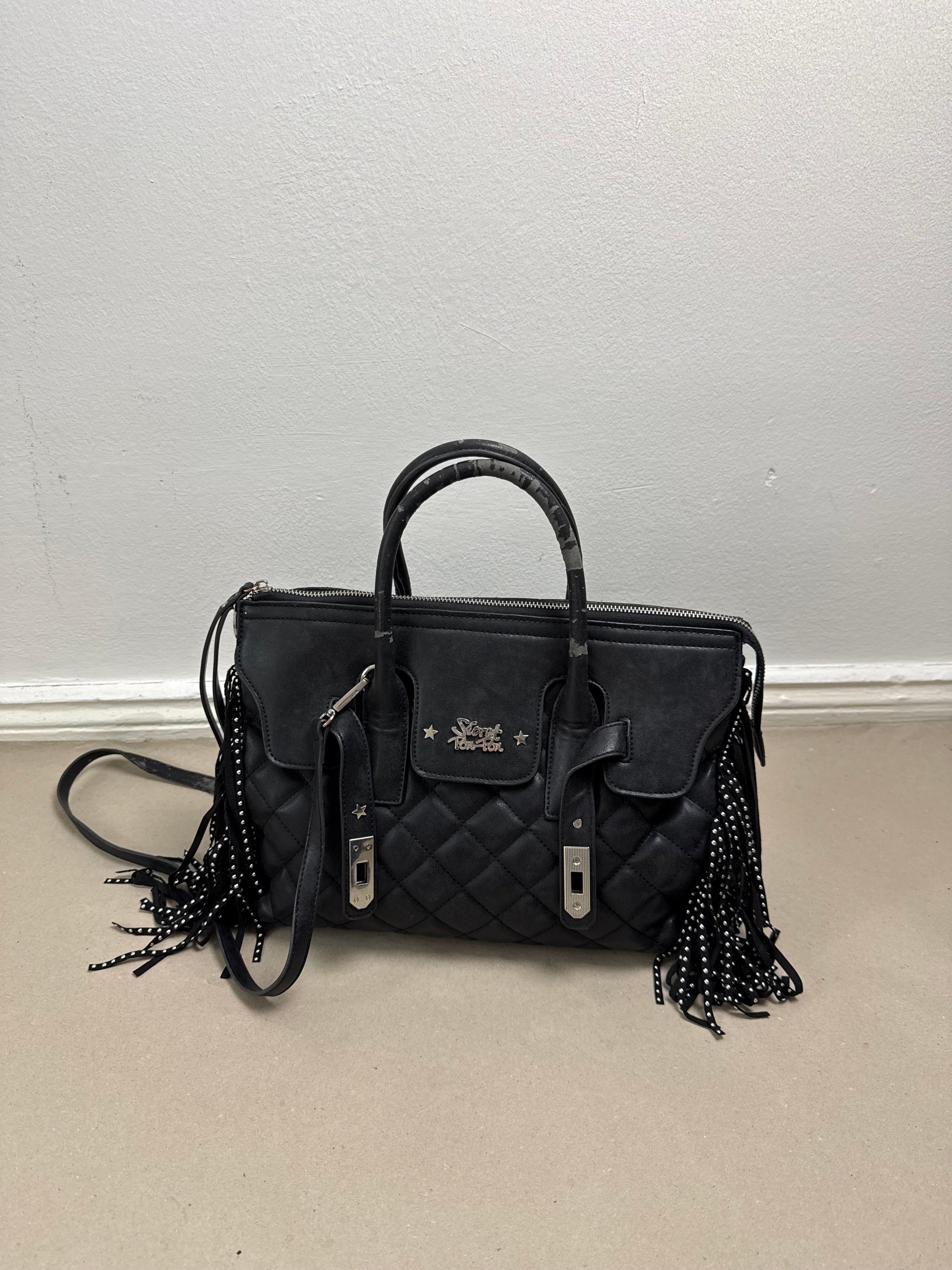 Black vintage firkin handbag quilted detailing, silver hardware, star accents and studded fringe on the sides