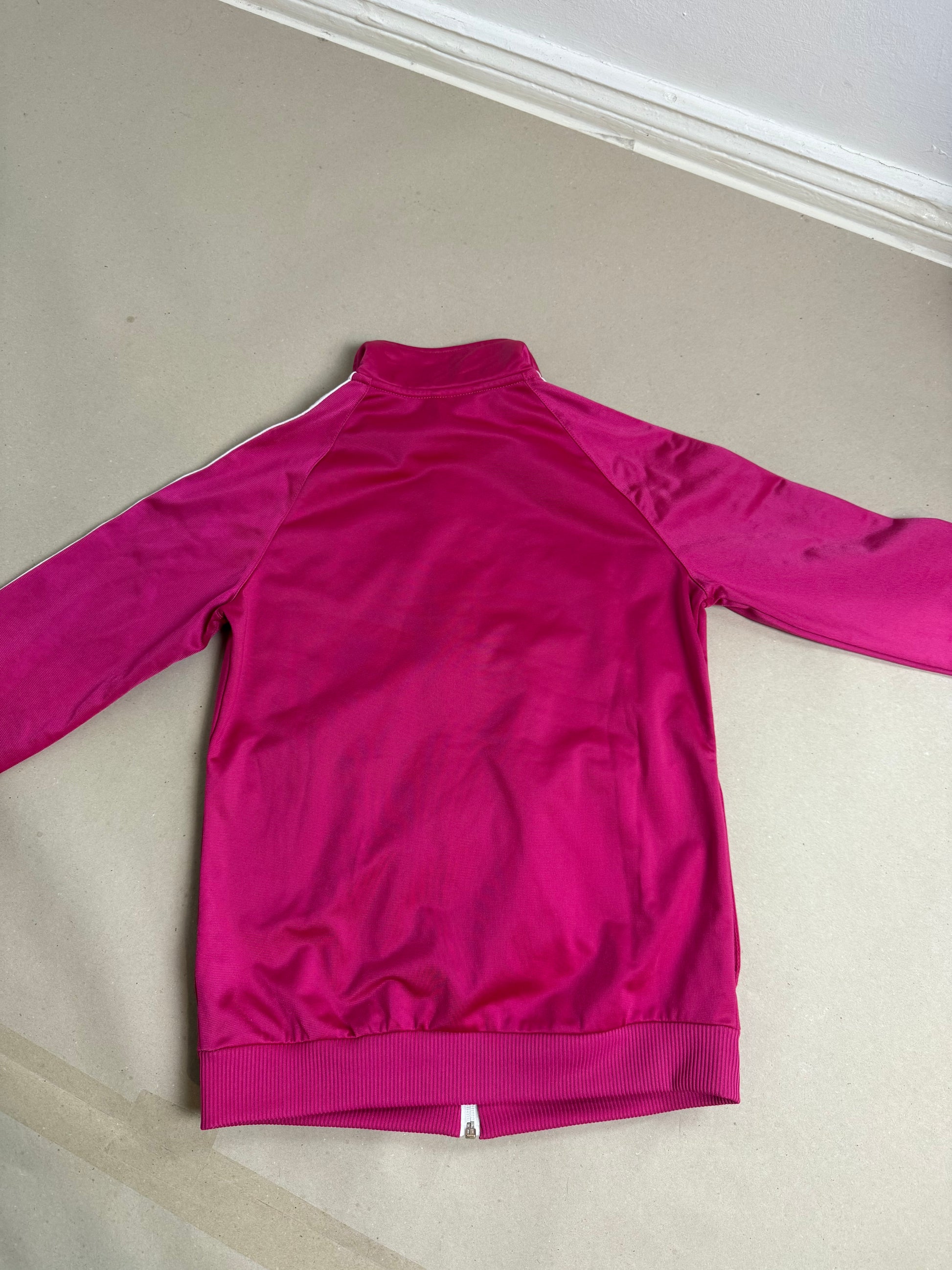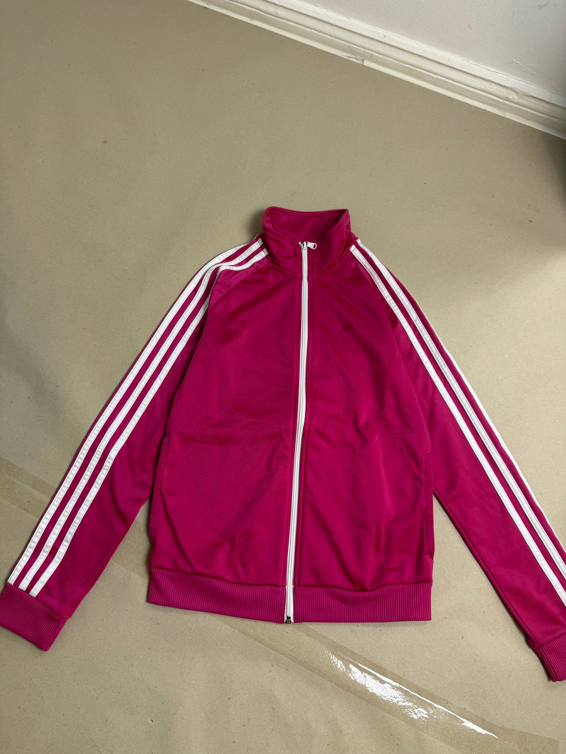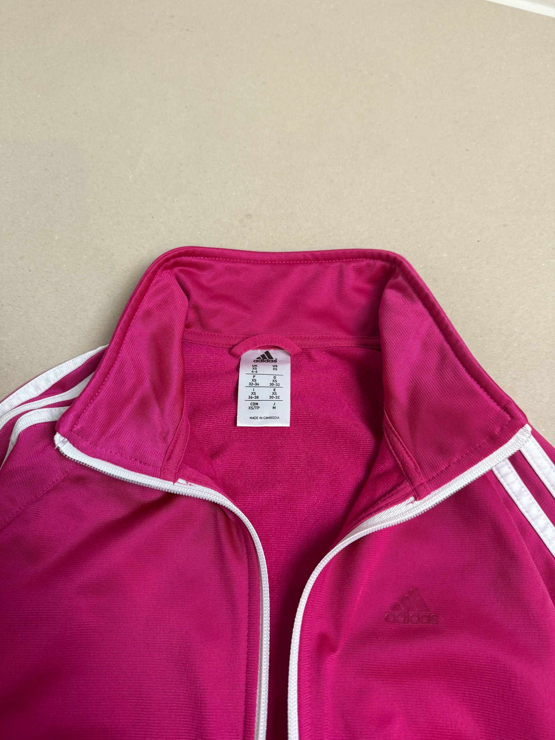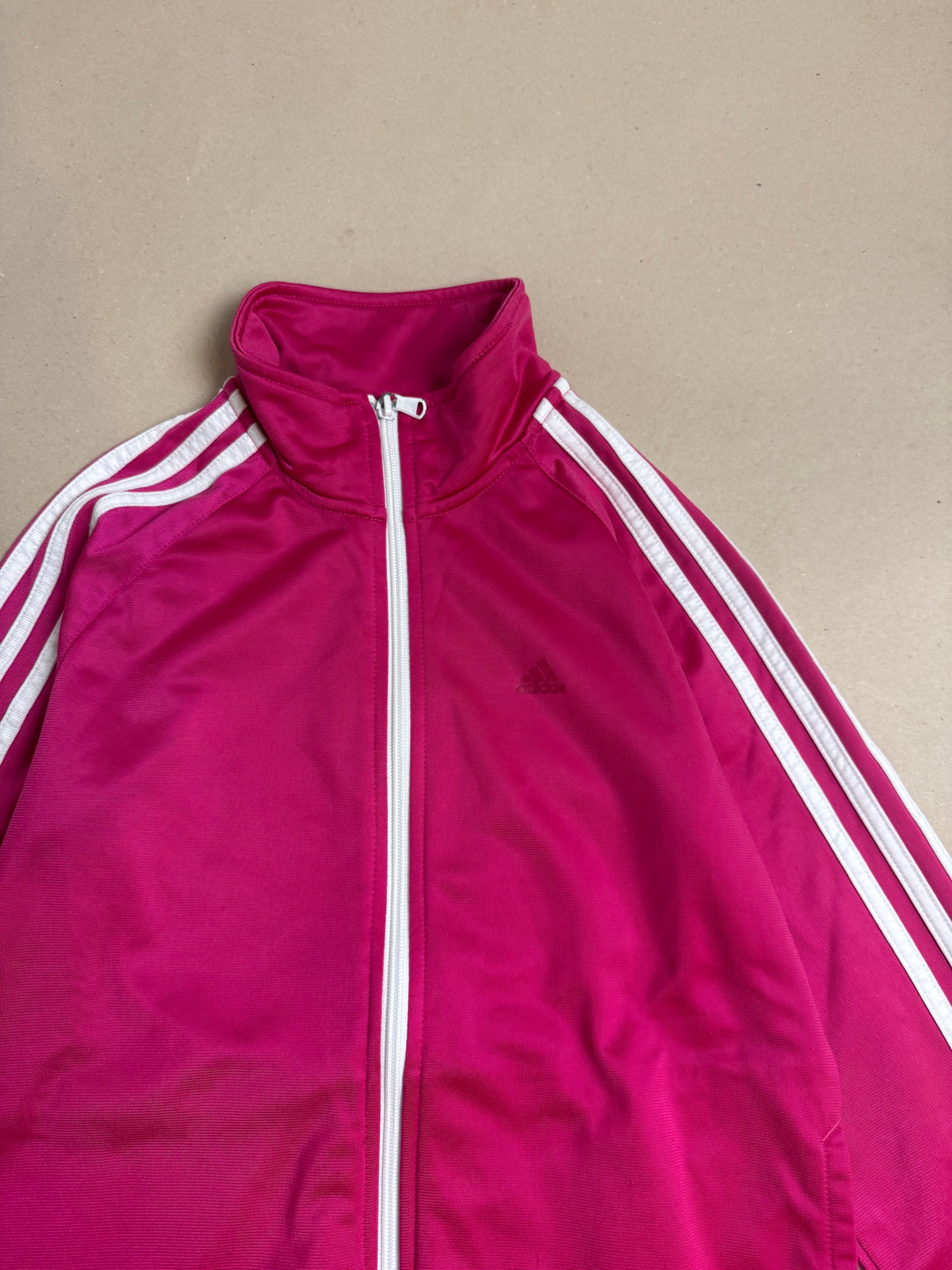 • pink adidas jacket: tag says XS, 30-32, slouchy fit, not oversized